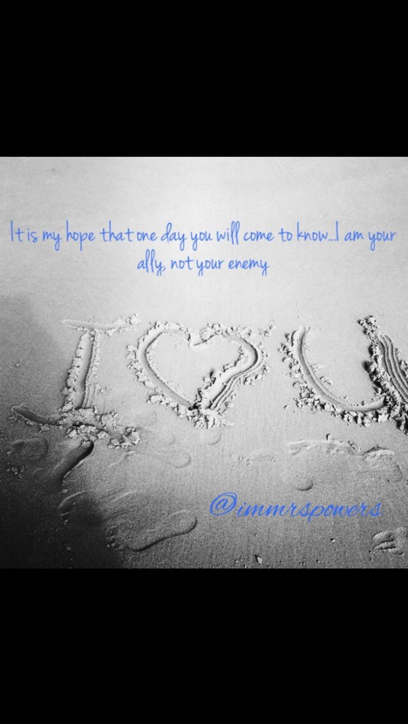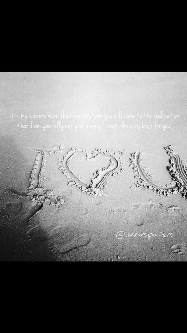 It is my sincere hope that one day soon you will come to the realization that I am your ally not your enemy. I want the very best for you, and push hard everyday for you to give your very best in all you do. “Winners never quit, and losers never win.” I’ve been saying this to you all of your life, and I know that this little saying has caused us strife. Please know that my pushing, rules, comments, and limits are all in LOVE! Believe it or not I too was pushed, had rules, and was set limits. I understand that in your age things are much bigger than they are for me. I really do try to put myself in your (those) shoes that I wore many years ago…seeing things from your perspective. I want more for you than I had, the sky really is the limit. Don’t give up on your self or sell yourself short. When your picked for second string or an alternate, put your heart into it to have a good attitude and be the best darn alternate there is or will be thus displaying LONG SUFFERING. I pray you learn PATIENCE (with others as well as self). Patience really is a virtue, though a learned one at times. I pray you that you portray FORGIVENESS. I pray you learn SELF CONTROL. I pray that you act with KINDNESS in all regards. Have FAITH in the outcome and it will be. Act in GOODNESS in all areas of your day. Be JOYFUL, and choose friends that keep your joy and you will be at PEACE. Always know that I trust you to make the right decisions and use what I’ve taught you along with common sense to do the right thing. I am however fully aware that you will fall, and will not always excercise MILDNESS. I am right here for you during all those times, though I cannot fight your battles, fix your heart ache, or do the work for you I am here as your ally to KEEP PUSHING YOU! I will always be that voice in your head saying get up and do it again. All of these things are said to you in LOVE, with the hopes that one day you will understand all the world is not against you my love, Mom.