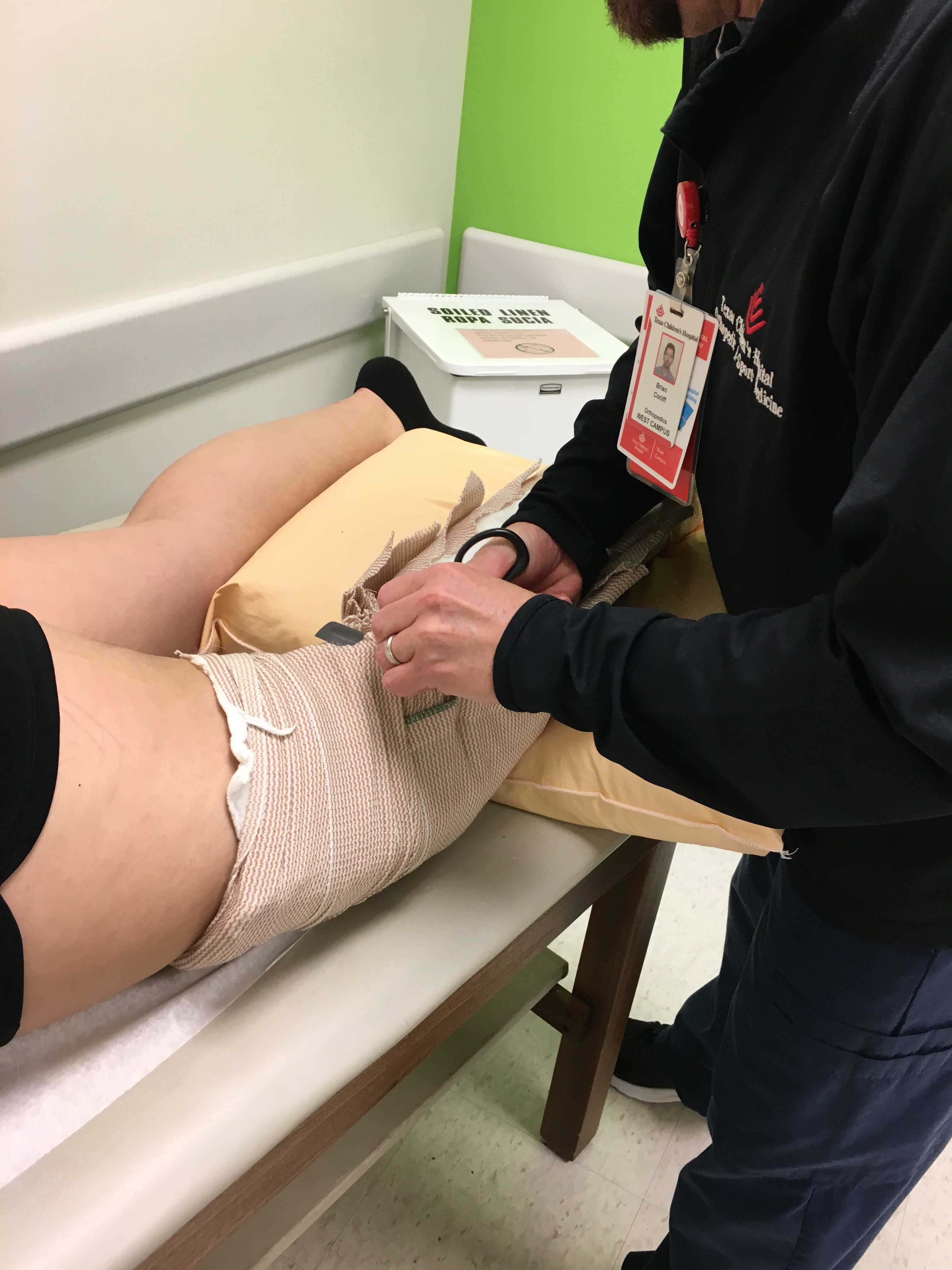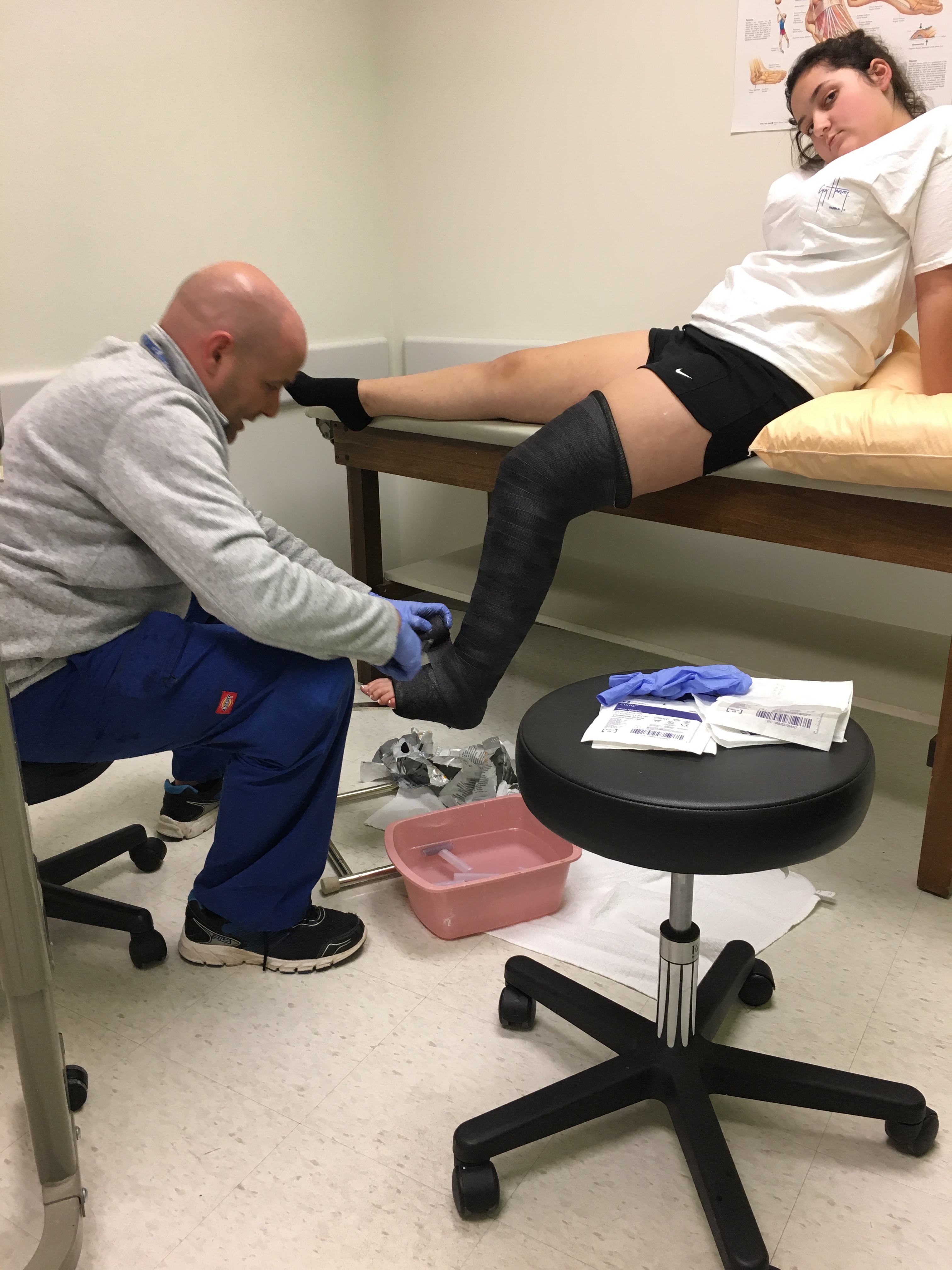 The nurse get the splint off and leaves it dressed, telling us Dr. Pederson will be the one to undress evaluate and then send us to the cast room.