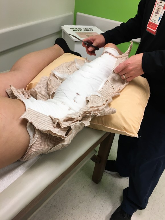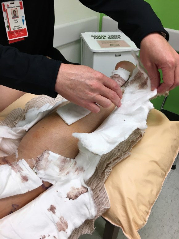 After signing we have a short wait before we are called to the back and Dr. Pederson’s nurse begins to cut the splint in two. This is our first time to see the scars and exactly what was done. Here it is folks.
