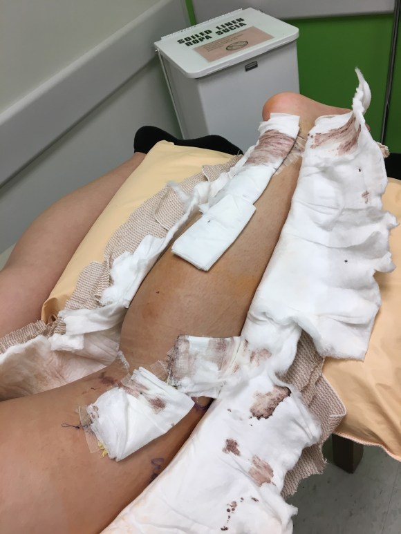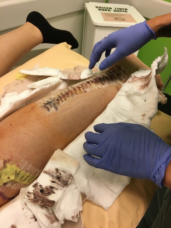 Lyndsey (PA) soon comes in and begins undressing the wounds and examining the scars. Again sorry if you get light headed from these images. Trust me it hurts more in this end.
