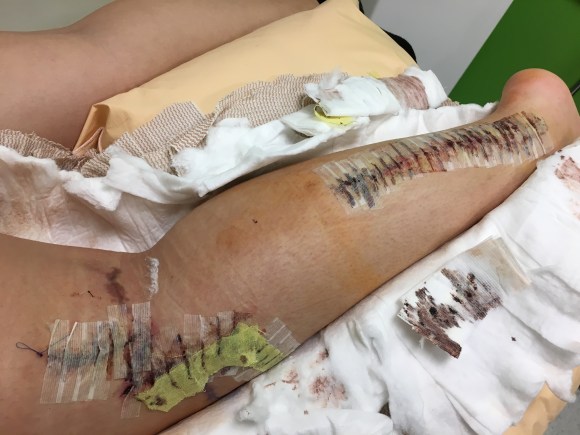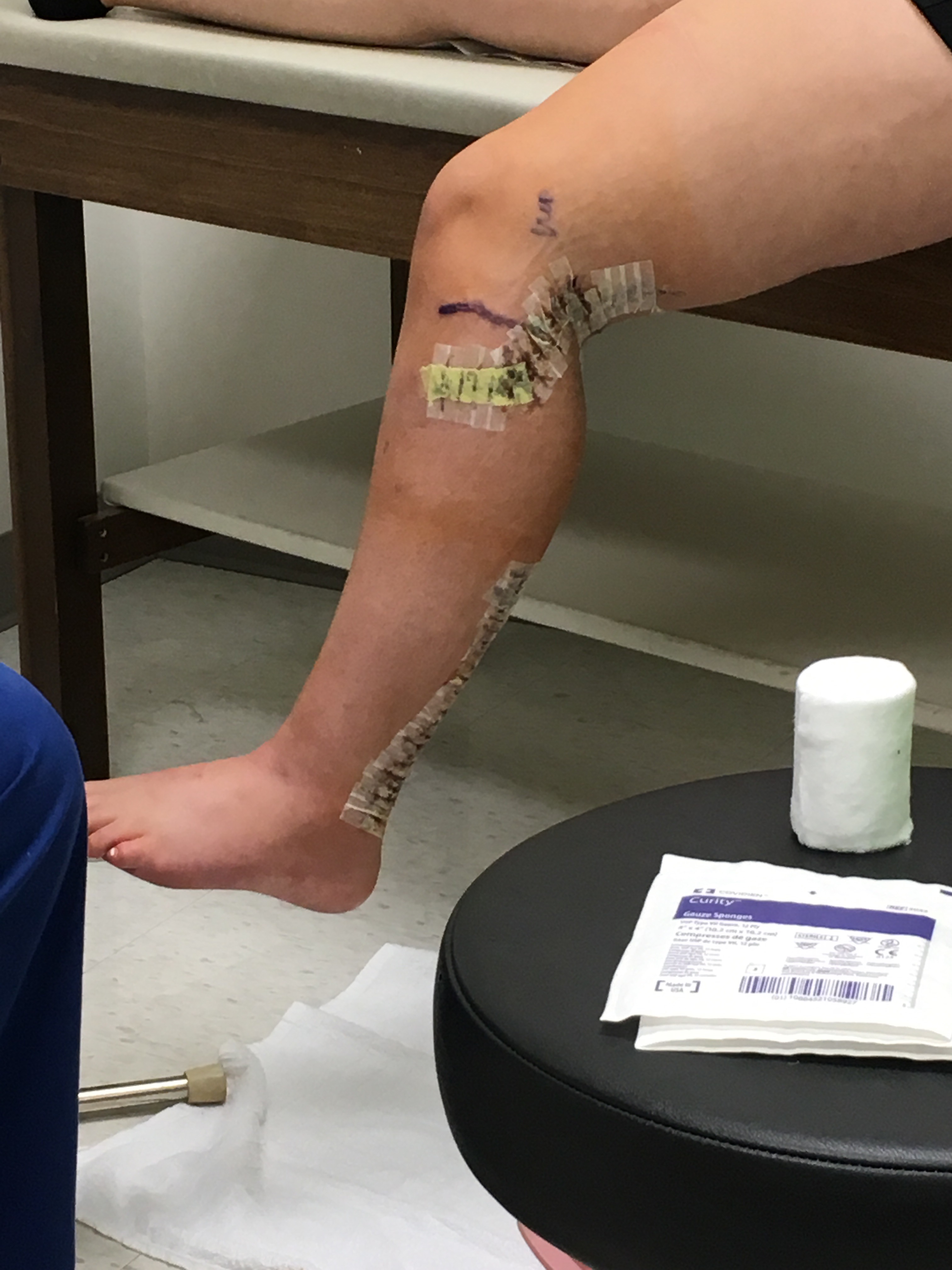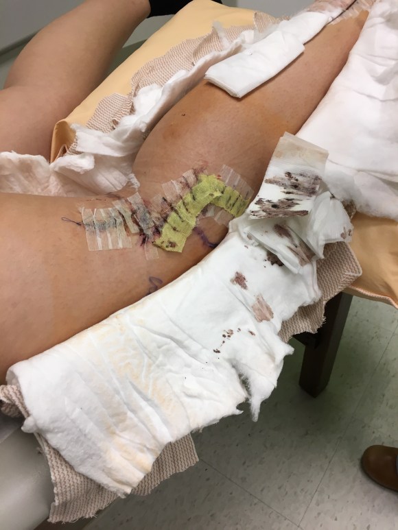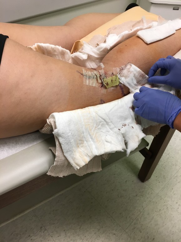 The zigzag at the knee is to keep pressure off the incision to prevent the dehiscence that was present after the last surgery. The incision is much larger than we expected as the Dr. had to come further down toward the knee to cut the nerve out. The incision at the ankle isn’t healing quite as fast as the knee and it too is much larger than we thought. All in all we went into surgery expecting ankle to knee so this is better than the original expectation however large it may be.