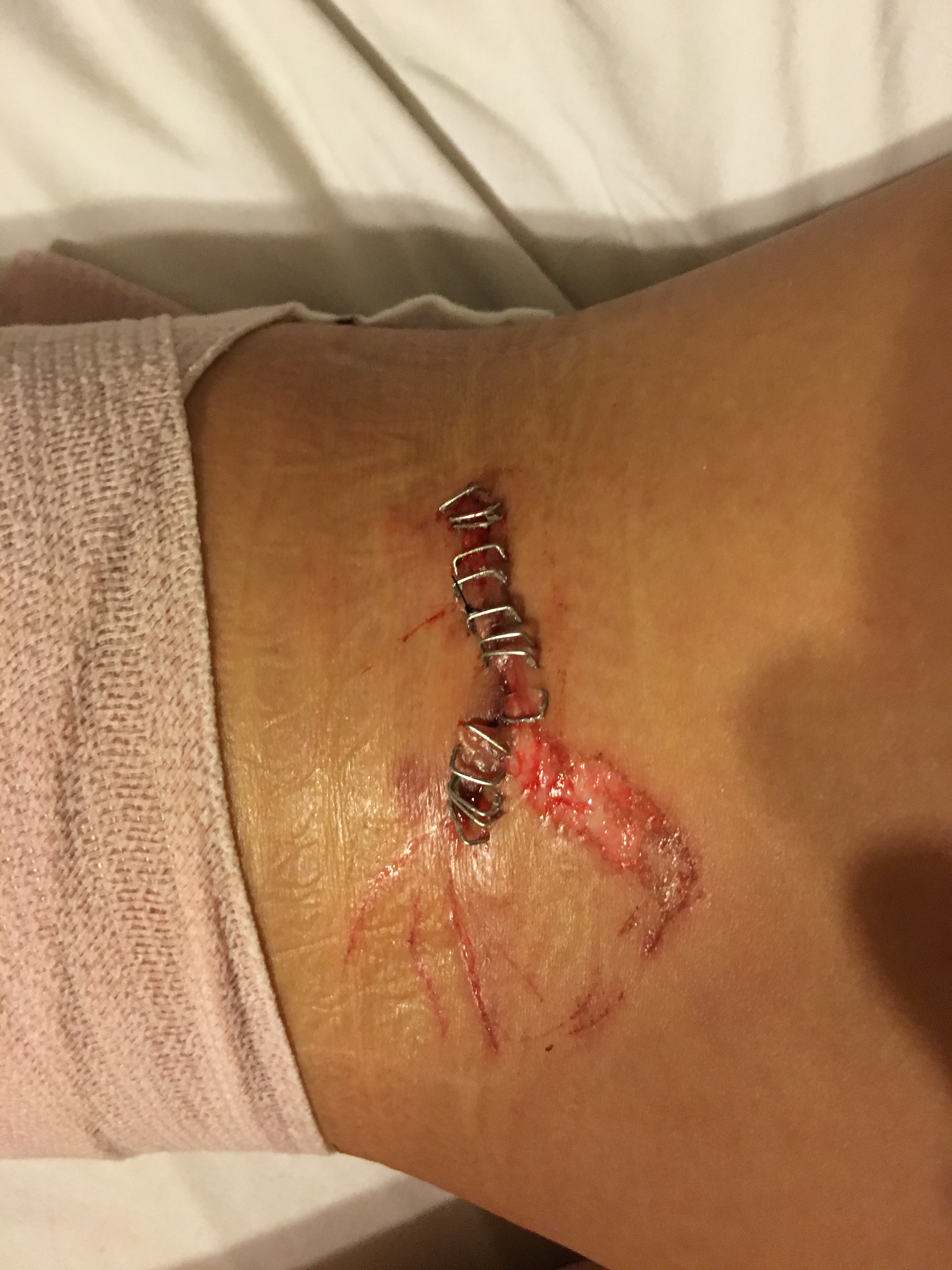 Lyndsey (PA) soon comes in and begins undressing the wounds and examining the scars. Again sorry if you get light headed from these images. Trust me it hurts more in this end.