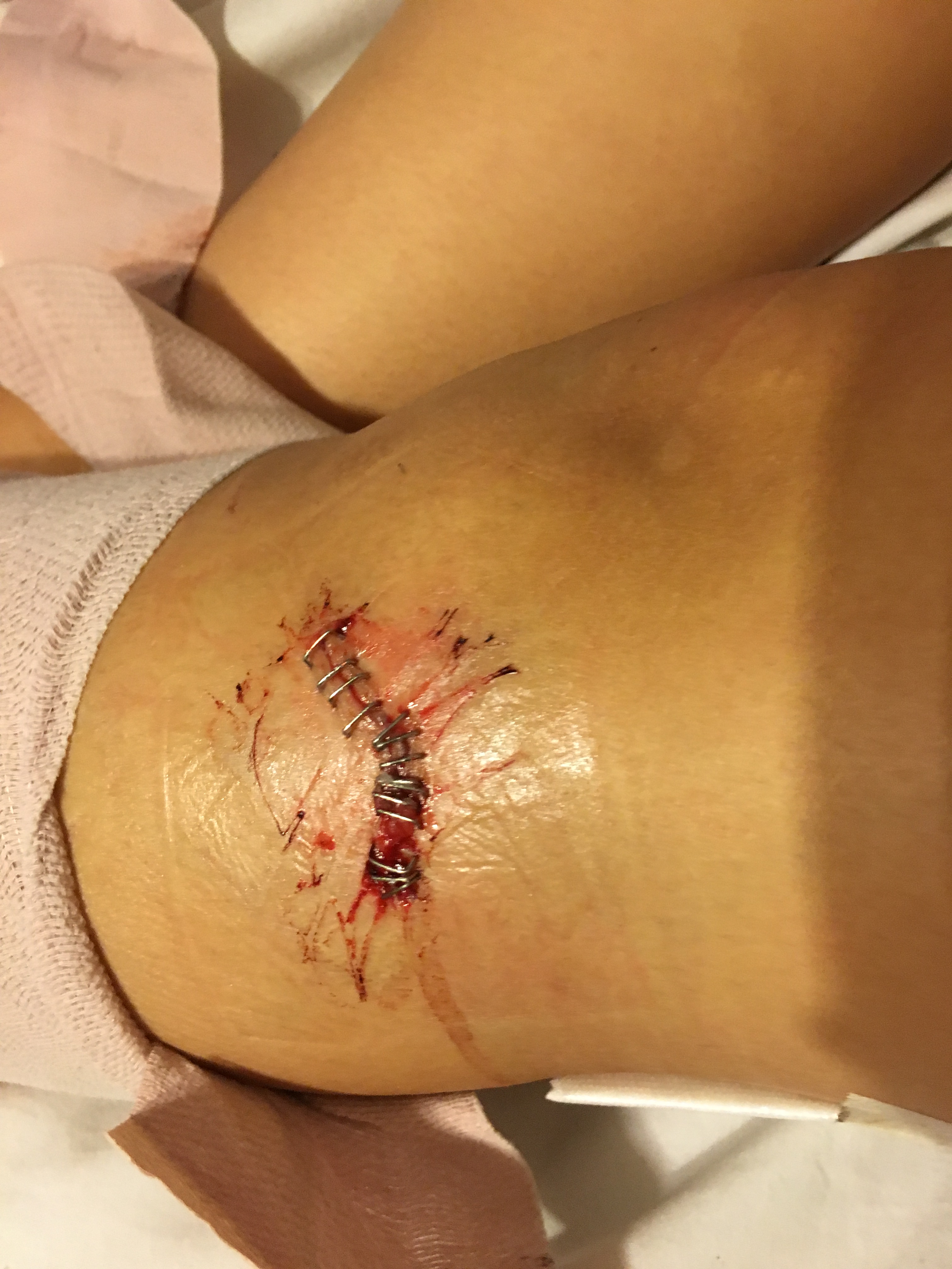 The zigzag at the knee is to keep pressure off the incision to prevent the dehiscence that was present after the last surgery. The incision is much larger than we expected as the Dr. had to come further down toward the knee to cut the nerve out. The incision at the ankle isn’t healing quite as fast as the knee and it too is much larger than we thought. All in all we went into surgery expecting ankle to knee so this is better than the original expectation however large it may be.