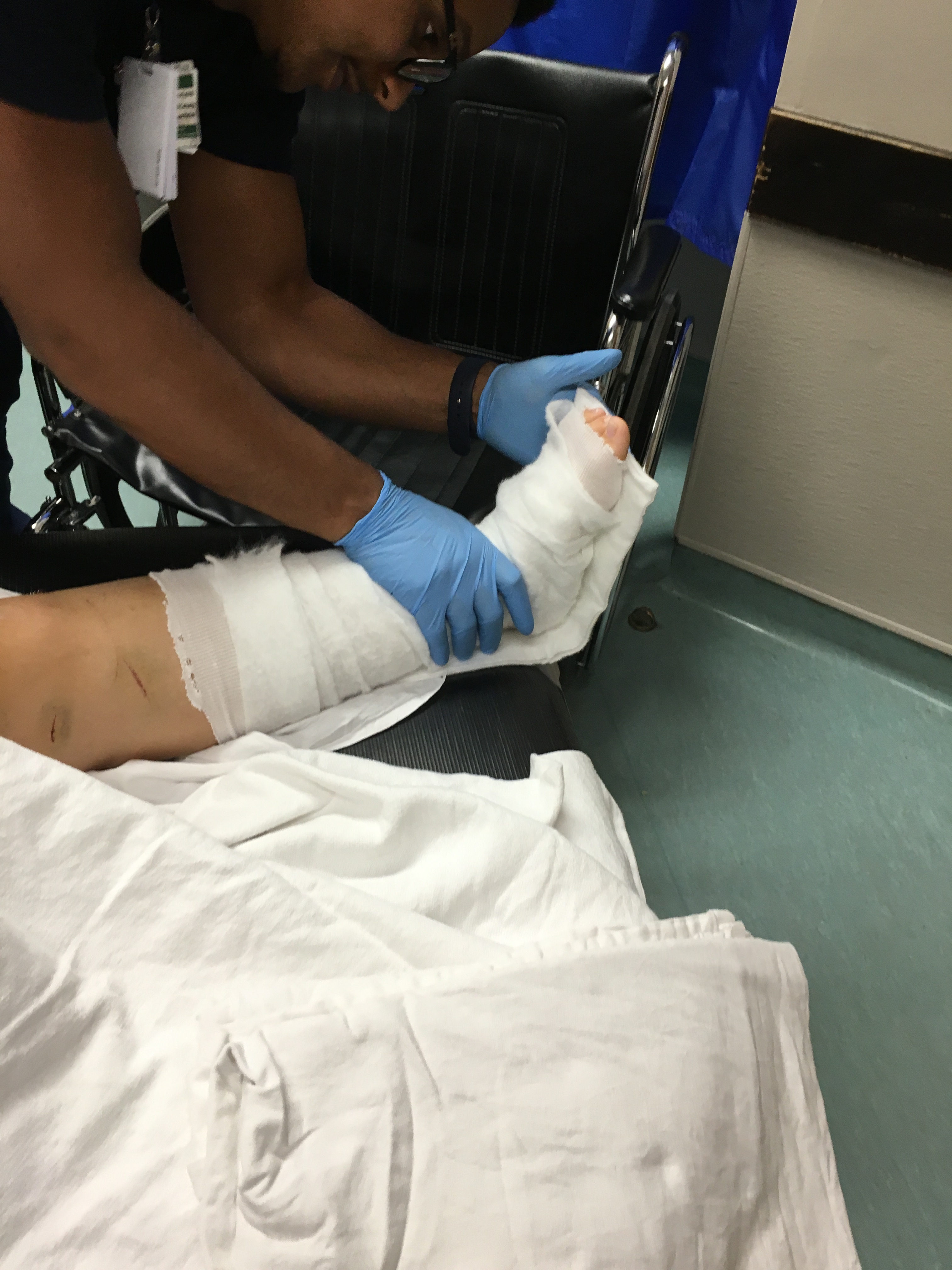 Getting a splint for drop foot at Lake Charles MemorialEntry point on the back of leg. Monday am.Monday, July 18, 2016 the phone rang at 4:36 am. It was Laken’s number. “Mrs. Midge it’s Sam, I’m here at the ER with Laken.” I quickly respond, “What, no Laken is in her bed asleep.” Sam says, “no ma’am I am here with her and she has hurt her leg.” The admissions clerk then gets on the phone and asks for permission to treat my 14 year old daughter. I give an immediate YES, followed by “wait does she need medical attention?” The clerk lets me know that indeed my daughter did need immediate medical attention. The next ten minutes were sheer angst, with tears flowing, stomach boiling, mind blowing white hot anger, and WORRY! After waking my husband, and daughter we get to the hospital and I speak to the clerk and give copy of the insurance card. She lets me know in which room I’ll find my daughter. Upon entering I see that Laken seems okay, she’s upright, she’s talking, she looks at me and our eyes meet. She looks down, my eyes follow and that’s when I see it; her leg is cut open and meat is hanging out, the nurses that are cleaning the wound then turn her leg and I see the backside is cut as well. My questions start flying, animal instinct had taken over. I wanted to know what, why, how, who did this to my baby? Come to find out it was my daughter’s own judgement that led to this injury, she made the decision to leave the safety of her room in our home and jump the fence. Little did she know that her adventure would come to a screeching halt when upon leaving she slips and falls on the fence becoming impaled in her lower left leg. I was told that she had to be lifted off that fence, and then carried to the car, I’m very thankful that the group of irresponsible teenagers then sought immediate medical attention for my daughter and drove her to the hospital. The Dr. comes into the room and says that nothing is broke and that he is going to staple her up, she will need to follow up with pediatrician and then have the staples removed in 2 weeks. Okay, not so bad- 2 cuts 28 staples, 2 stitches, and a few scrapes and bruises. Leaving with a script for pain, no antibiotics because the risk of infection is so high and they do not want any resistance to arise. We get Laken home and she’s complaining of numbness and tingling, I think it’s trauma. She spends the better half of the day sleeping from the codeine and being up all night no doubt. Monday afternoon/evening brings pain and lots of it! Pain in the foot, ankle, and leg. She is unable to lift her foot, this is causing ankle pain. Monday night brings little sleep. Tuesday morning we wake up so that she can get to guard practice to observe and be present for her team. She is in so much pain, and her leg and foot are spotted white. We head to the pediatrician instead of practice. Our all wise and knowing ped is on vacation to London “UGH” so we see the one that is available. Not always a good thing! The pediatrician examines the leg and listens to our questions she really doesn’t know the extent of damage or she doesn’t want to tell. She says she is referring us to a wound care specialist and that they will in turn refer to a neurologist and then other specialists. The nurse comes in cleans the wounds and dresses them. We leave with a new prescription for ibuprofen. Tuesday evening/ night brings more pain and weekness. Her foot is just kind of dropped over and she is unable to move it, hubs wraps the ankle with an ace bandage to see if it will help support the ankle. In the middle of the night we remove the wrap as the pain is unbearable. Codeine and ibuprofen 600 every three hours and my baby is still crying in pain. Uncontrollable pain, immobility, and feelings of stupidity, lead to depression. We wait for the wound care specialist to call overnight. Wednesday morning brings anxiety and upset as wound care tells me that they cannot see her because the wound is closed. Wound care advises me to call the pediatrician for a referral to a neurologist. After repeated calls to the pediatrician and messages we hear nothing. Finally this afternoon the pediatrician office calls and says head to New Orleans and go through the ER to see a neurologist. I reach out to my sister the family RN. She makes a few phone calls and suggests the ortho team at Memorial before leaving town. We swing by Memorial and they do X-rays and a few Drs. perform simple neuro exams. They tell me they are pretty sure that she has nerve damage along with tendon, muscle, and ligaments, and needs to go to a neuro but they are going to call the orthopedic surgeon for a consult. The orthopedic surgeon says that he cannot touch her until a neuro surgeon sees her. They put a splint from the bottom of the wound to the tip of her toes and send us to New Orleans. Here we are with the recently applied splint now off after yet another simple neuro exam waiting full lower extremity X-rays and more.